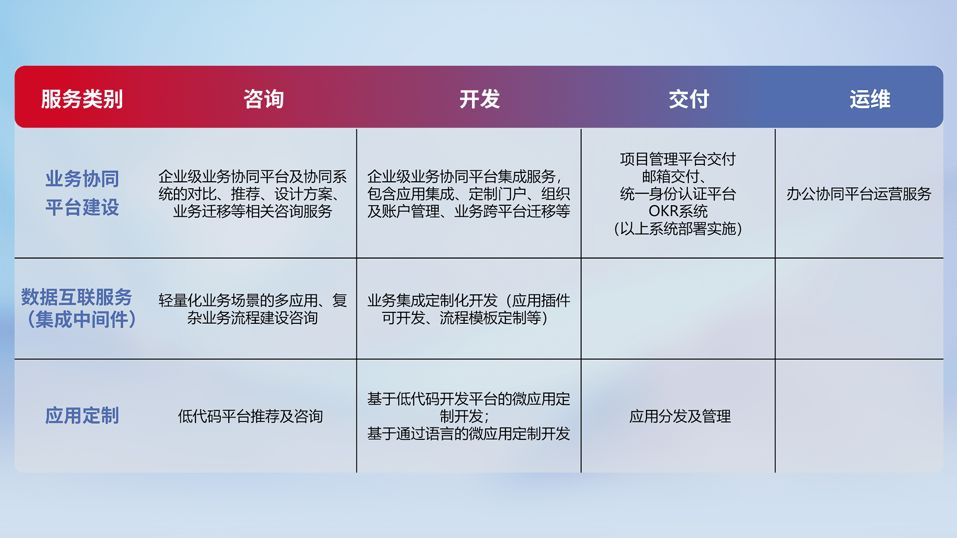 针对钉钉、、、、企微、、、IDaas等平台级产品提供产品的规划、、、、方案、、、、交付、、定制化开发等服务,,实现如统一协同办公、、、、智能客户服务、、混合会议管理、、、、智能数据查询、、、等业务场景,,,,实现数字化转型。。