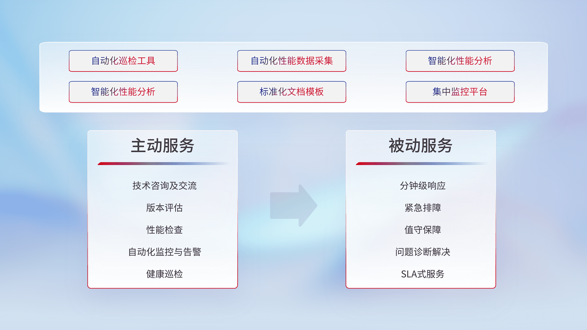智能化工具和标准化文档,,,保障服务质量,,,提供主动服务(包含技术咨询、、版本评估、、性能检查、、、、自动化监控与告警、、、健康巡检)和被动服务包含(分钟级响应、、、紧急排障、、、、值守保障、、、问题诊断解决、、SLA服务)。。。。
