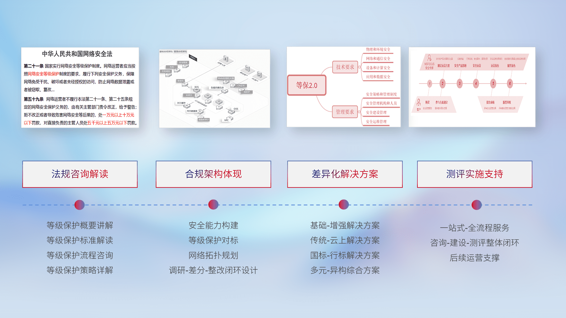通过专业的法律咨询解读、、、合规架构体现、、、、差异化解决方案、、测试实施支持等服务,,,为客户量身打造等保合规体系。。